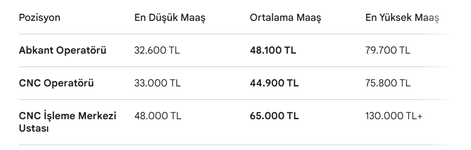 Abkant ve CNC operatörlüğü, 2026 yılı itibarıyla klasik “makine kullanıcısı” profilinden çıkıp, dijitalleşme ve yapay zeka entegrasyonuyla daha teknik bir uzmanlığa dönüşmüş durumda. Özellikle metal sanayi ve savunma sektöründeki hareketlilik, bu meslek gruplarına olan talebi ve maaş beklentilerini yukarı çekiyor.
