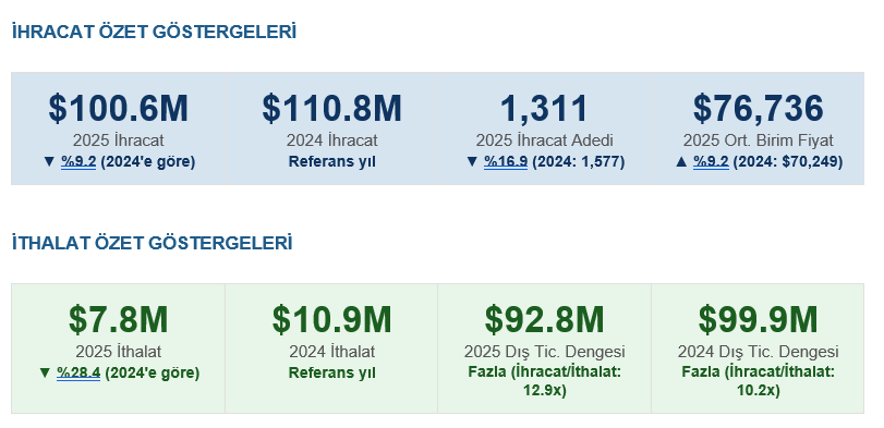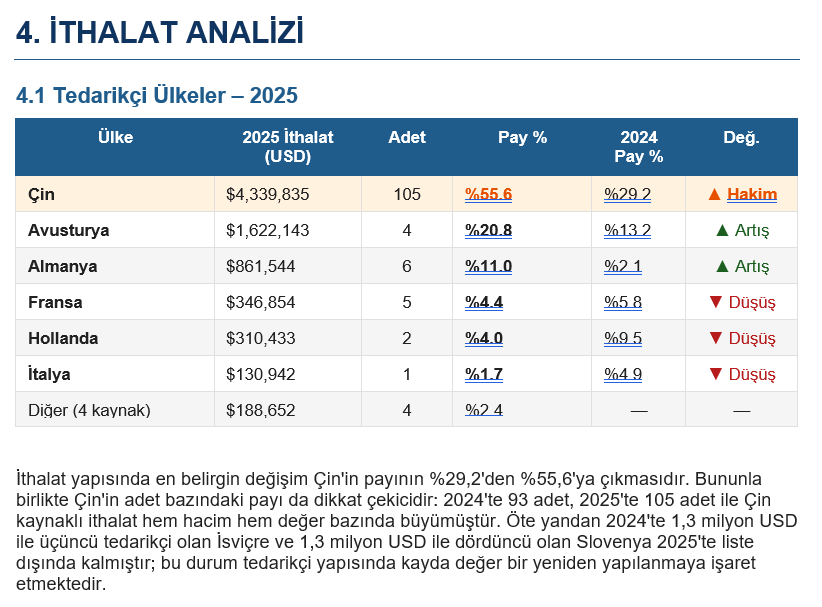 • İthalat değeri 2025’te %28,4 azalmış; bu durum ya yerli üretim kapasitesinin artışından ya da talep daralmasından kaynaklanmaktadır.