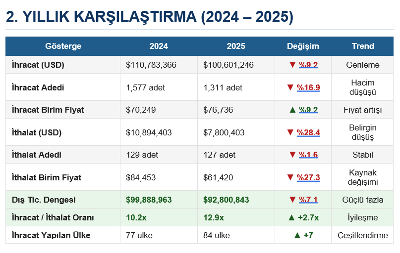 • Ortalama birim ihracat fiyatının artması (70.249 → 76.736 USD), üst segment ürün yelpazesine kayışın işareti olabilir.