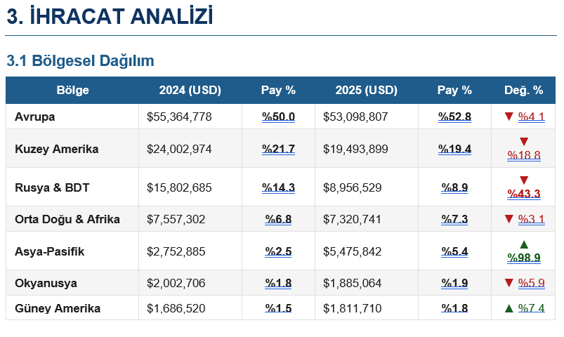Rusya & BDT bölgesindeki %43,3’lük sert gerileme dikkat çekicidir. 2024’te Rusya Federasyonu’nun 10,8 milyon USD ile ikinci sırada yer alması, 2025’te ise 4,6 milyon USD’ye gerilemesi; jeopolitik risklerin ve olası yaptırım etkilerinin somut yansımasıdır. Öte yandan Asya-Pasifik’in neredeyse iki katına çıkması, Hindistan başta olmak üzere yeni pazar açılımlarının ilk işaretleri olabilir.