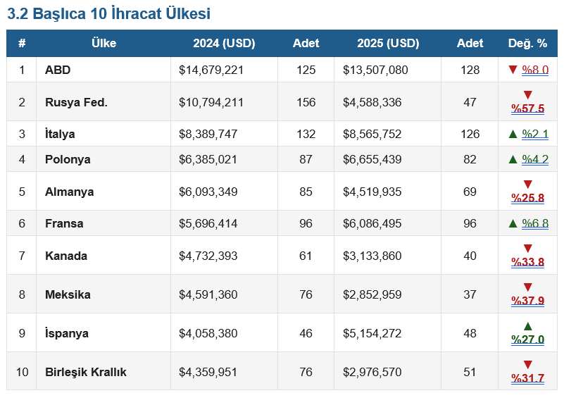 ABD, her iki yılda da lider konumunu korumuş ve toplam ihracatın yaklaşık %13’ünü oluşturmuştur. İtalya, adet bazında hafif düşüşe karşın değer bazında büyüyerek istikrarlı bir pazar olmayı sürdürmüştür. Polonya ve Fransa da değer artışıyla olumlu tabloya katkı sağlamıştır. Rusya’nın ciddi gerilemesi, Kuzey Amerika’daki Kanada-Meksika düşüşü ve Birleşik Krallık’ın %31,7 gerilemesi ise dönemin kritik kayıplarıdır.